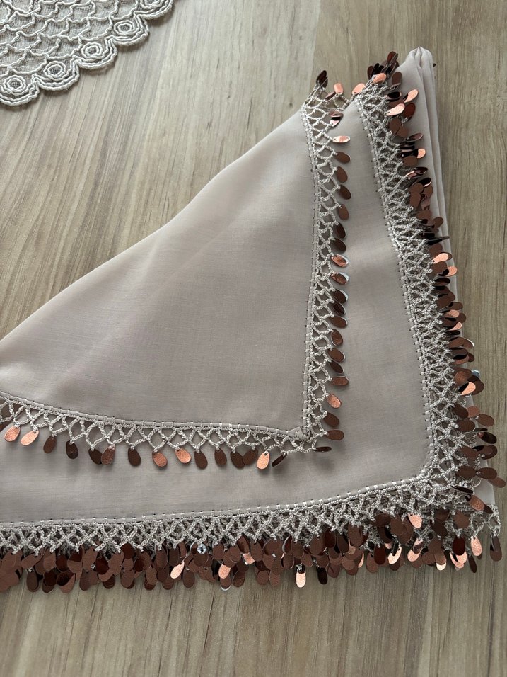 Sipariş alınır Bej renginde, dantel detaylı ve payet süslemeli kadın fuları. Yumuşak tekstil kumaştan yapılmıştır, bohem ve retro tarzlara uygundur.