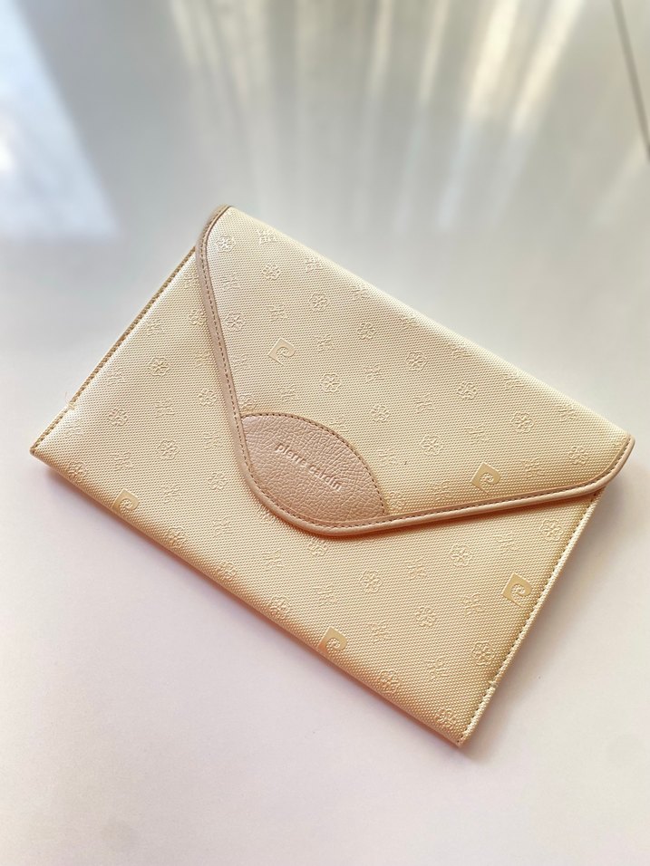 Bej renk, deri kadın portföy çanta, dantel detaylı ve desenli, modern klasik tarzda, ofis için uygun pastel tonlarda.