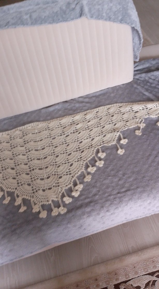 Bej renkte, dantel detaylı triko şal. Bohem ve retro tarzlara uygun, rahat ve şık bir aksesuar. el örgusu inci boncuk detayli