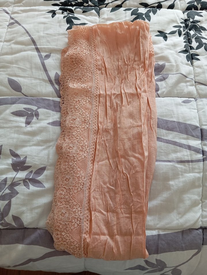 Bej renkte, dantel detaylı keten kumaştan yapılmış, bohem ve retro tarzı yansıtan kadın şalı.