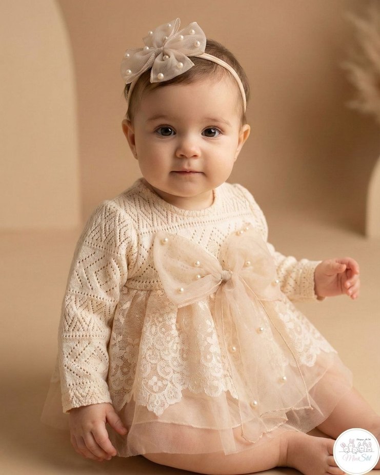 Sıfır etiketli ürün.Uzun kollu, kayık yaka ve bej renkte bu kız çocuk elbisesi, dantel işlemeli triko kumaş ve büyük fiyonk detayıyla modern klasik tarz sunar. Romper bedenler; 3-6 6-9 9-12 12- 18 ay