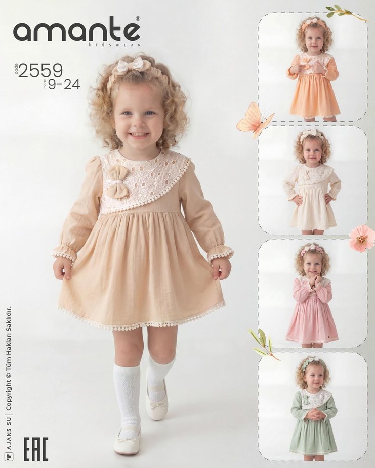 ®️ AMANTE 9-12-18-24 AY ✅ 1. Kalite Kumaş Orijinal Kalıp Pamuklu, uzun kollu, bol kesim kız elbisesi. Bej renkte, tekne yaka ve nakışlı dantel detaylara sahip.