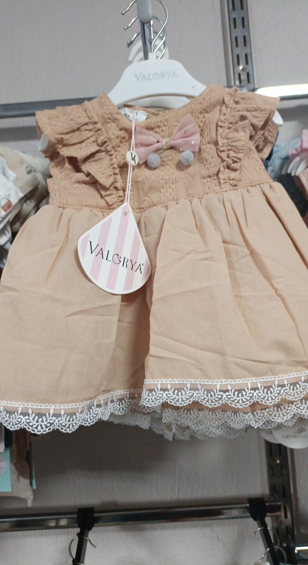 Bej renk, dantel işlemeli, V yakalı, kolsuz ve bol kesim kız elbisesi. Pastel bohem tarzda, süslü fiyonk detaylıdır.
