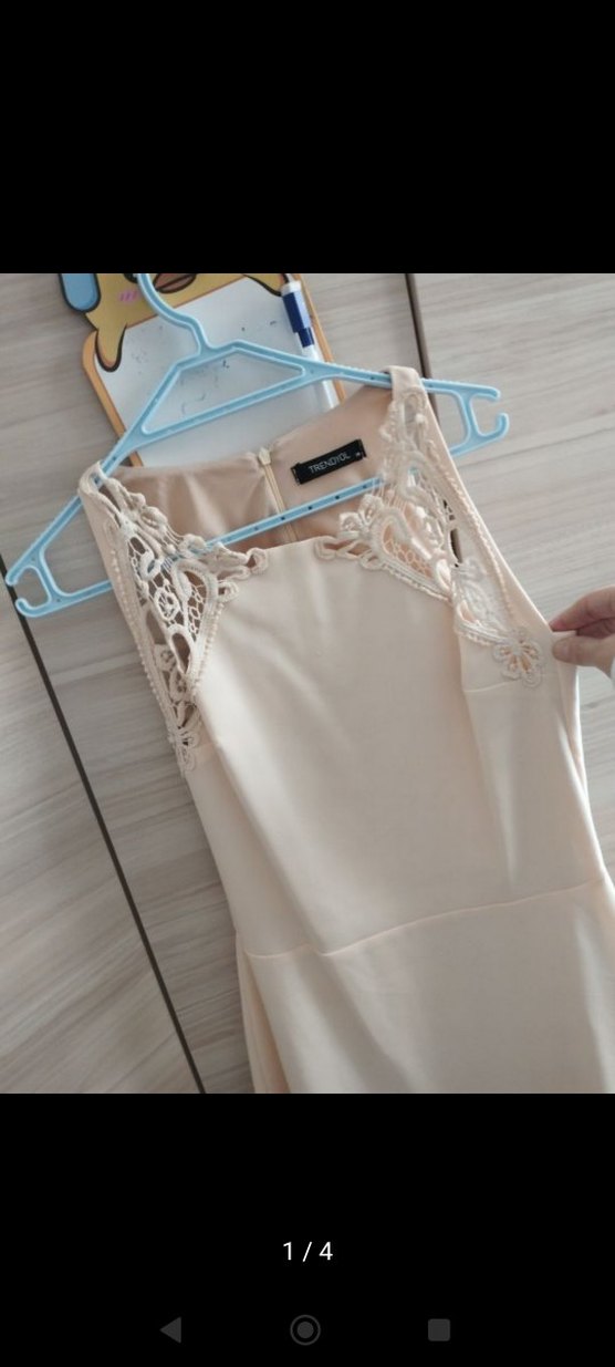 Bej renkli, dantel detaylı, kolsuz midi boy abiye elbise. Klasik bohem tarzıyla düğünler için uygun, vücuda oturan kesim.