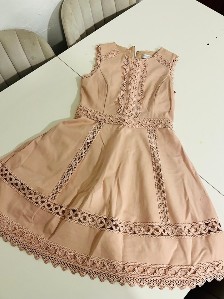 Bej renk, dantel işlemeli, V yaka ve ince askılı bu midi elbise, klasik zarafetle bohem tarzını birleştirir.