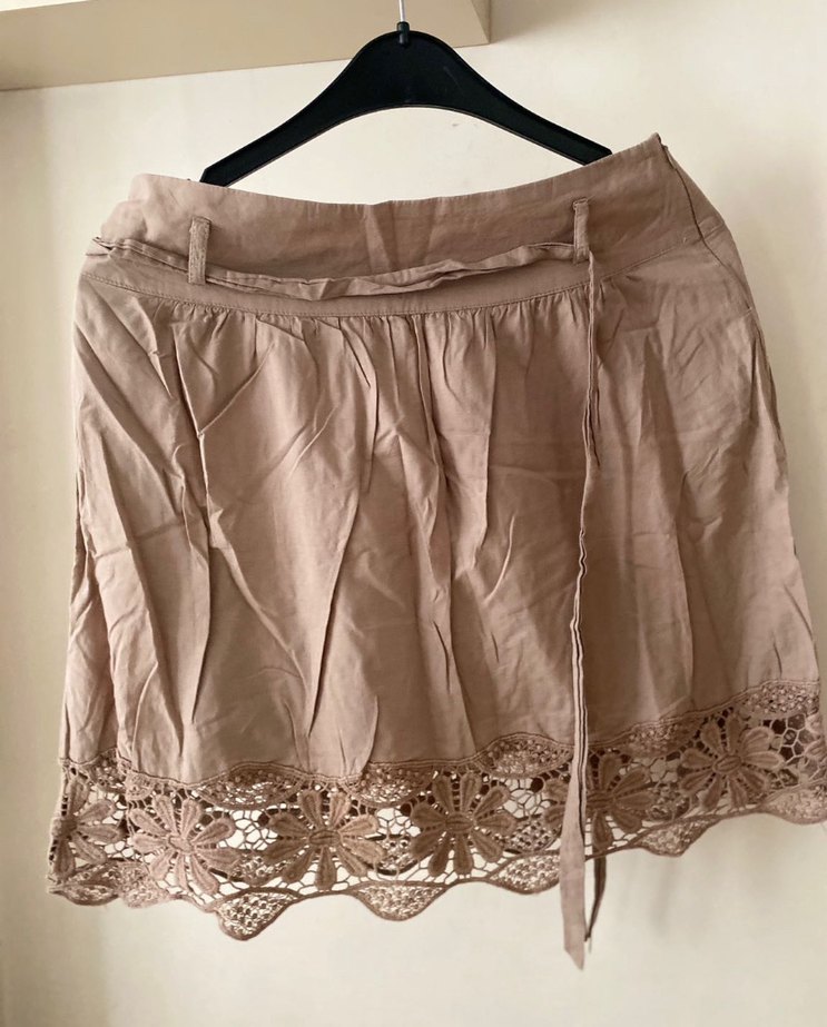 Bej renkli, keten kumaştan, bol kesim midi etek, alt kısmında dantel detayları bulunur. Romantik akşamlar için uygundur.