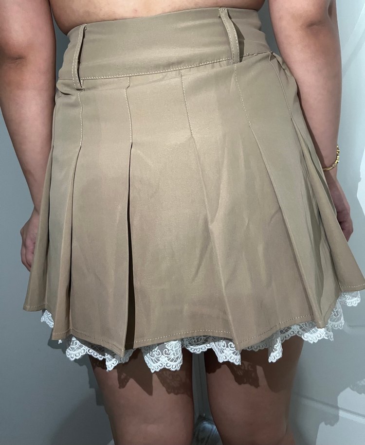 Bej renkte, dantel detaylı mini etek. Rahat kesimi ve sokak stiliyle, yumuşak sentetik kumaştan üretilmiştir. Etiketl fotoğrafta yok ama mevcuttur