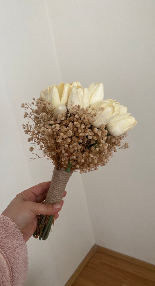 Bej renkte, dantel detaylı ve minimalist bohem tarzda klasik zarafete uygun gelin buketi.