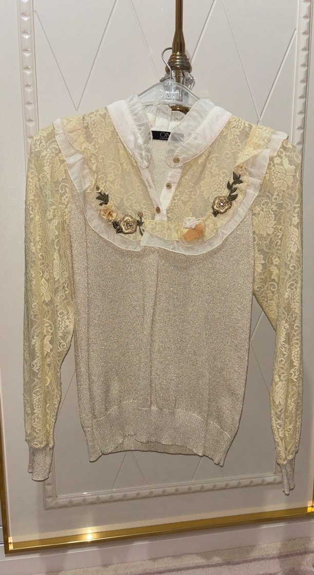 Bej renkli, dantel kollu ve nakışlı detaylara sahip, bol kesim vintage bohem tarzda kadın kazak.