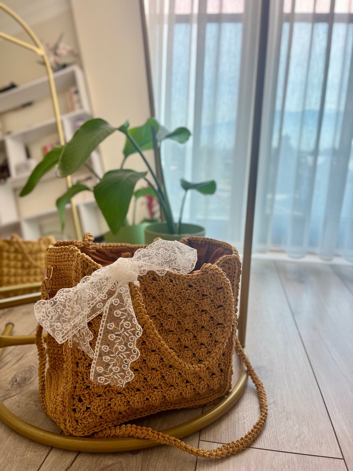 El yapımı bej çanta. Astarı vardır, formunu korur ve talep edilen ölçüde hazırlanır. Vintage ve bohem tarzını yansıtan aksesuarlar eklenir.