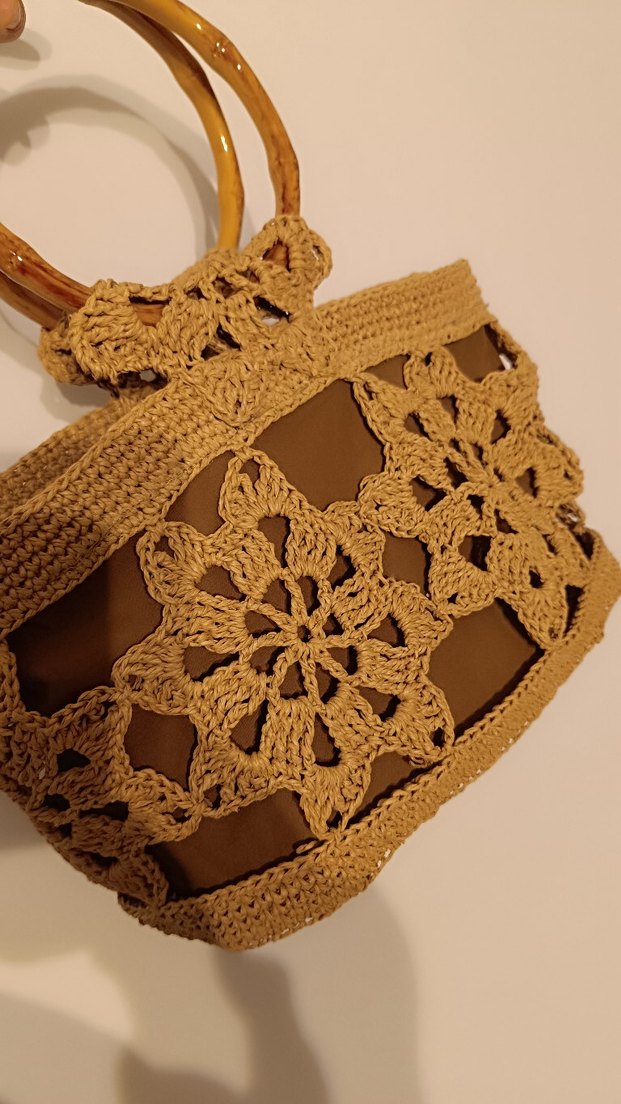 Ahşap saplı, dantel işlemeli bej örgü çanta. Parlak dokusu ve bohem tarzıyla günlük kullanıma uygundur.