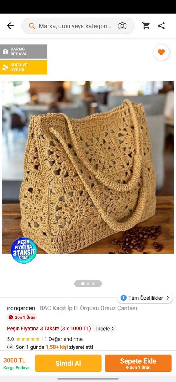 Bej renkli, dantel detaylı örgü omuz çantası. Bohem tarzı ve günlük kullanıma uygun, kağıt ipten el yapımı hafif tasarım. İstenilen renk örülür .Trendyolda fiyatı 3000 TL.