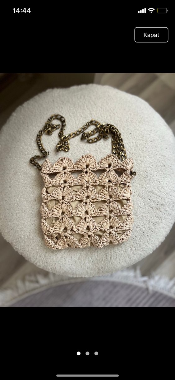 Bej renkli, dantel detaylı örgü kadın çanta. Hafif renk tonu ve metal zincir askıya sahip, bohem vintage tarzında.