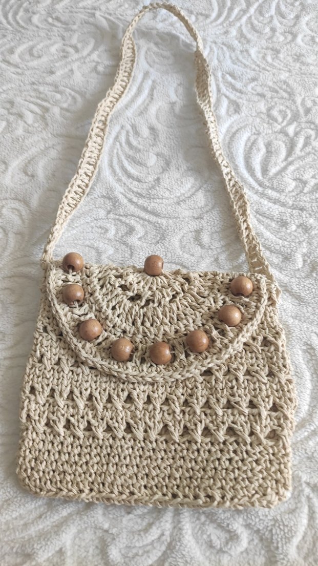 Bej renkte, dantel detaylı ve ahşap boncuk süslemeli örgü kadın çantası. Bohem tarzda, günlük kullanım için uygun.