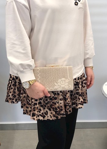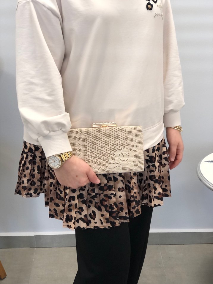 Bej renkli, dantel detaylı ve yılan desenli örgü dokulu kadın portföy çanta, günlük kullanıma uygun şık bir modeldir.