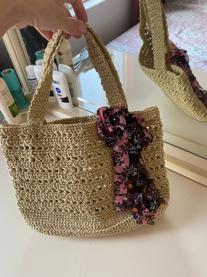 Bej renkli, dantel detaylı örgü kol çantası, üzerindeki çiçek desenli fularla bohem tarzını yansıtıyor.