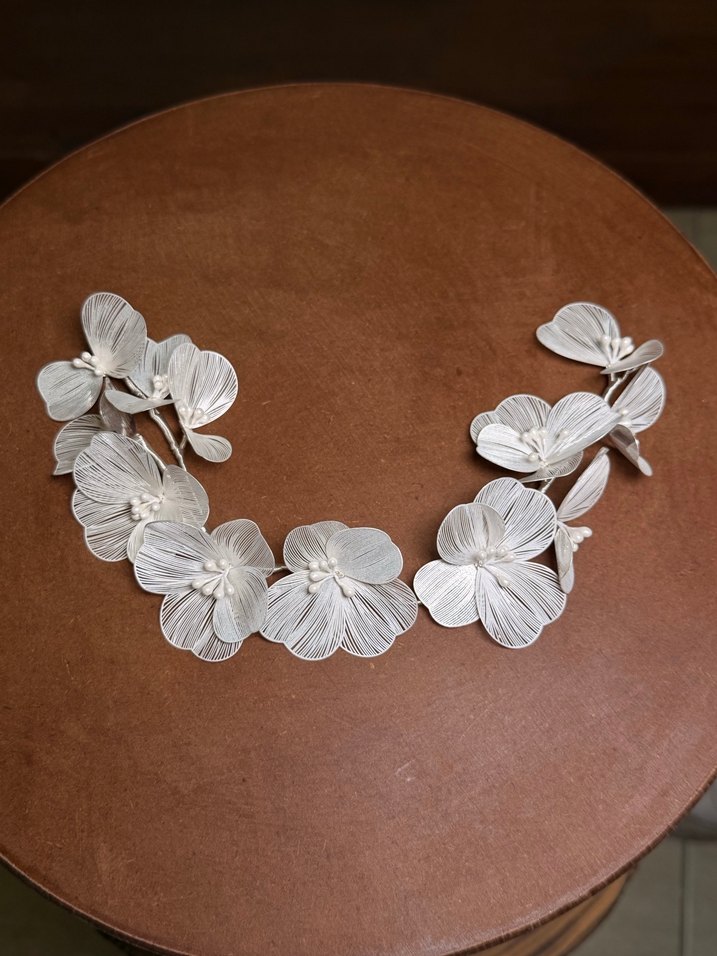 Bej renkte, dantel detaylı seramik çiçeklerden oluşan vintage bohem saç aksesuarı.
