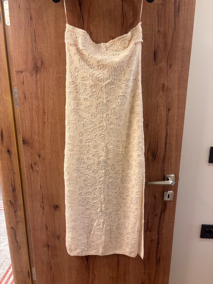 Bej Dantel Detaylı Straplez Uzun Triko Elbise
