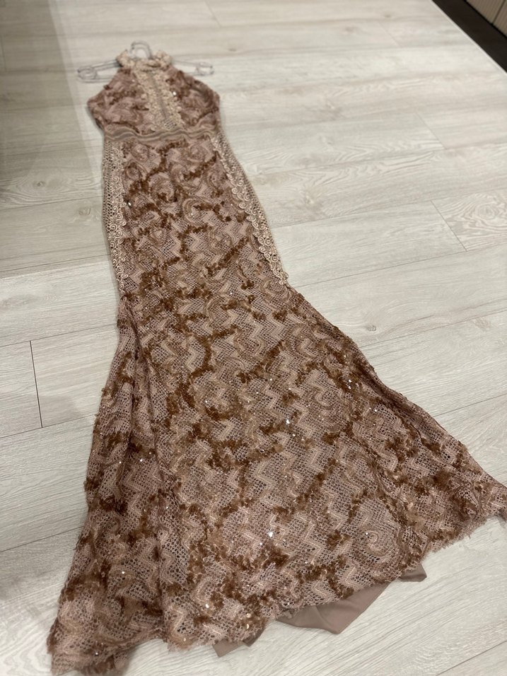 Bej Dantel Detaylı Uzun Abiye Elbise
