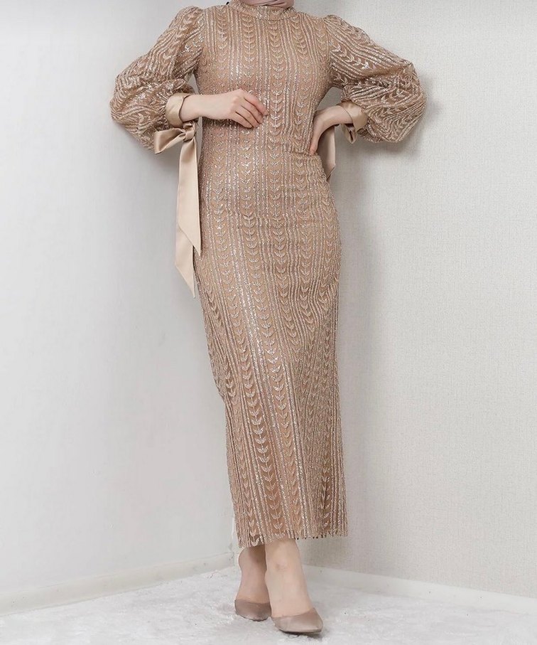 Bu bej renkli, uzun ve vücuda oturan abiye elbise yüksek yakalı ve dantel detaylı askılı kollara sahip, klasik zarafeti modern bir tarzla buluşturuyor.