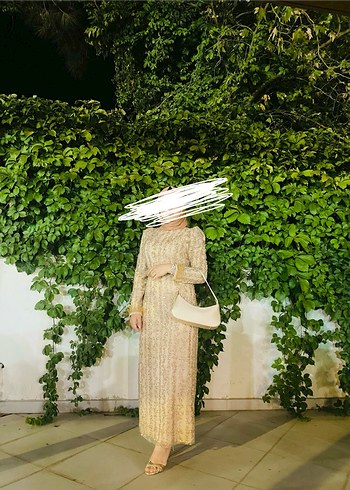 Bej renkte, dantel ve çiçek desenli uzun abiye elbise. Yüksek yakalı, uzun kollu ve klasik zarafeti bohem stil ile buluşturan rahat kesim. Etiket bedeni 42 ama dar kesim olduğu için ben 36-38 beden arasıyım bana anca oldu isteğe göre şalıyla birlikte satabilirim