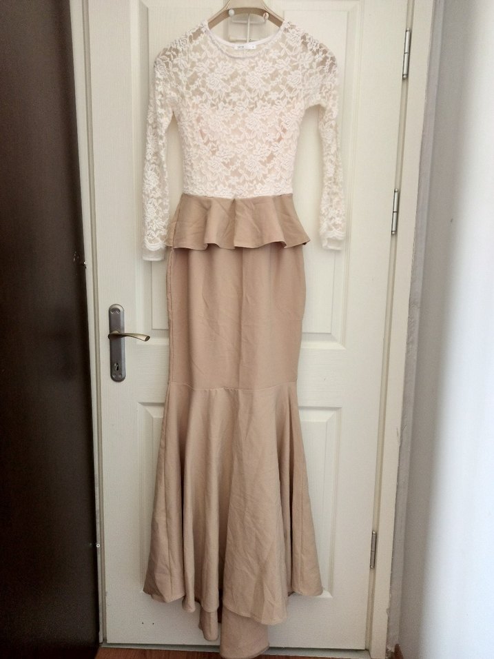 Bej renkte, uzun kol dantelli, kruvaze yakalı, belden volan detaylı, uzun ve fitted kesim abiye elbise.