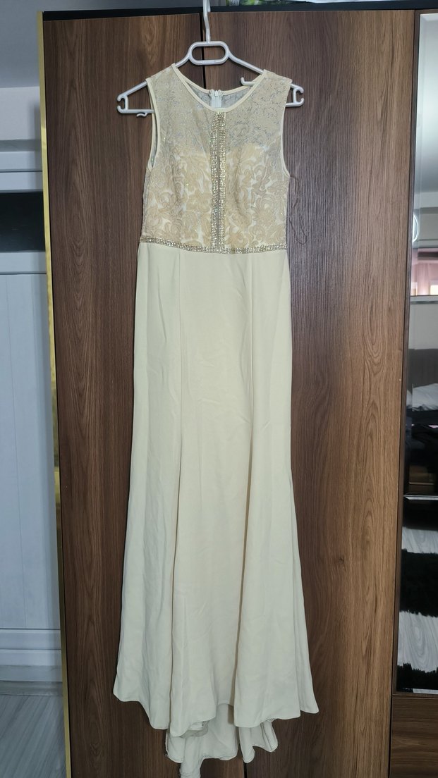 Dantel işlemeli üst kısmı ve straplez yaka detayı olan, bej renkli, uzun ve kolsuz abiye elbise. Rahat kesimiyle şık bir seçim.