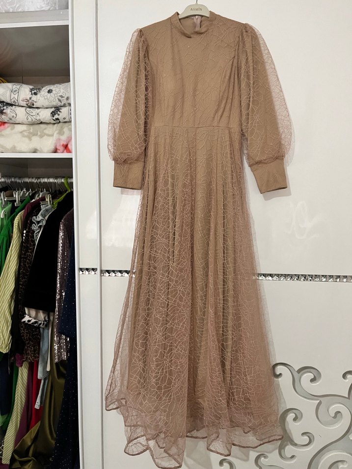 Bej Dantel Detaylı Uzun Kadın Abiye Elbise