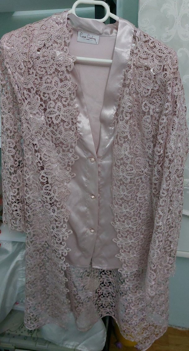 Bej renkte, uzun kollu ve dantel detaylı vintage tarzda, rahat kesime sahip uzun kadın sabahlığı.