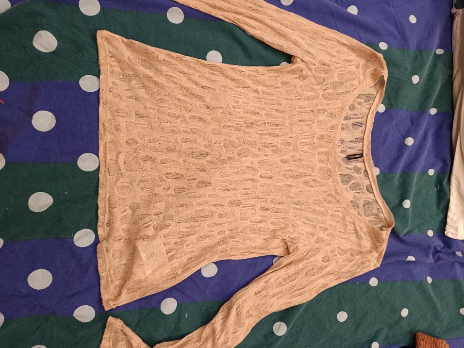 Bej renkte, keten kumaştan, dantel detaylı ve uzun kollu, tek renk, boğaz kesimli, vintage bohem tarzında, günlük kullanıma uygun kadın kazak.