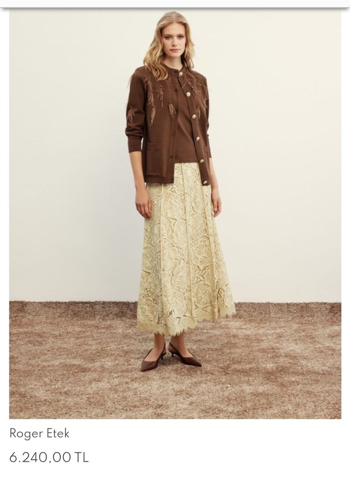 Bej renkte, pamuk kumaştan üretilmiş, dantel detaylı ve bol kesim uzun etek. Ofis için uygun, bohem ve retro tarzda.