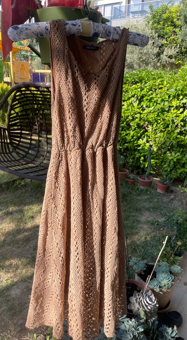 Bej renkte, dantel detaylı ve v yaka uzun triko elbise. İp askılı ve vücuda oturan kesimiyle bohem tarzı yansıtıyor.