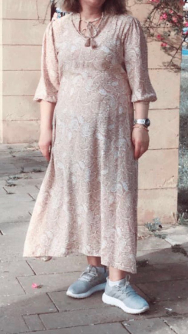 Dantel detaylı, V yaka uzun kollu, bol kesim bej elbise. Pastel tie-dye desenli, yumuşak sentetik kumaştan üretilmiştir.