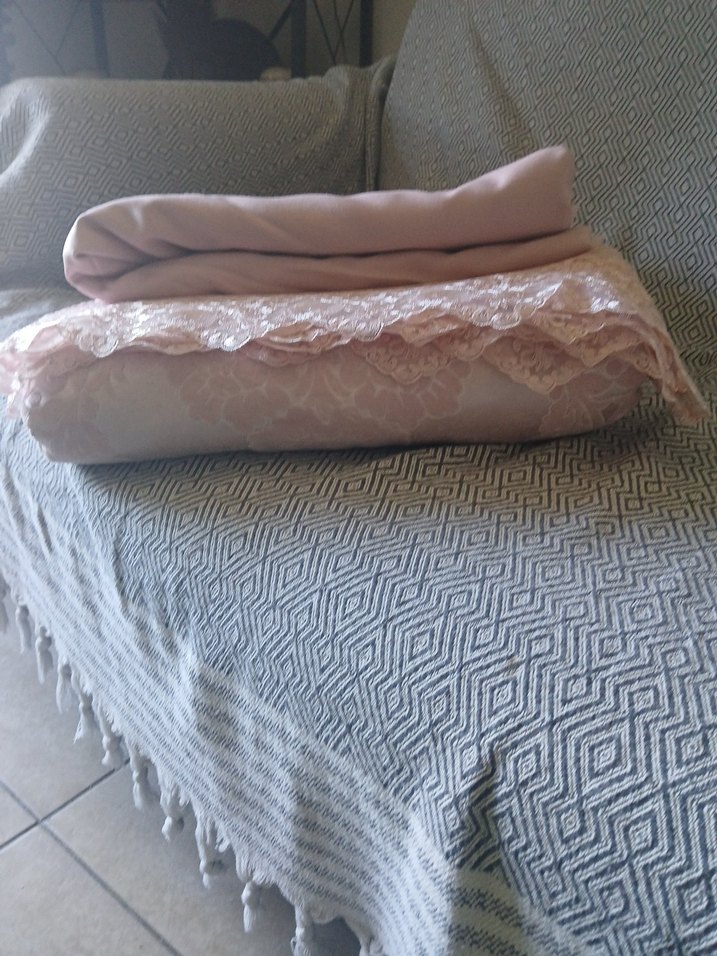 Bej renkli, dantel detaylı ve pastel tonlarda yumuşak kumaştan yatak örtüsü ve çarşaf seti.