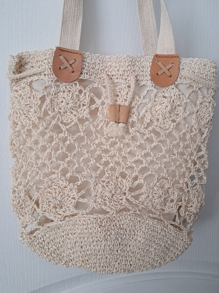 Bej renkte, işlemeli dantel detaylara sahip örme kadın çanta. Bohem tarzını yansıtan sağlam sapları vardır.