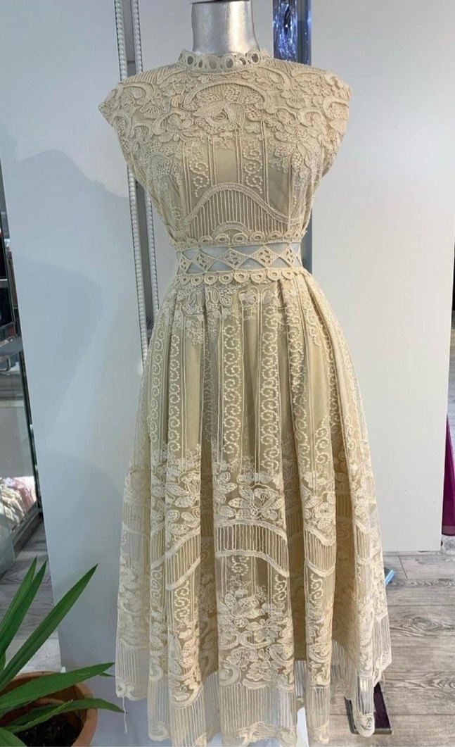 Bej renkte, uzun boy dantel işlemeli, yüksek yakalı ve kolsuz abiye elbise. Vintage bohem tarzıyla klasik zarafeti yansıtır, düğünler için uygundur.