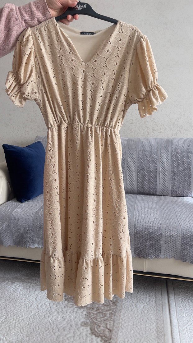 Bej renkte, V yakalı, kısa balon kollu, işlemeli dantel detaylı bohem tarzda uzun ve bol kesim elbise. Bel kısmı büzgülü, günlük kullanıma uygun.