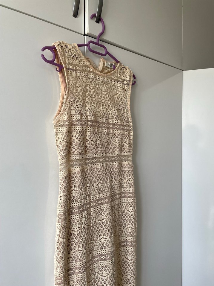 Bej renkli, dantel detaylı ve işlemeli desenlere sahip kolsuz triko elbise. V yaka ve vücuda oturan kesimiyle bohem tarzı yansıtıyor, düğün için uygun.