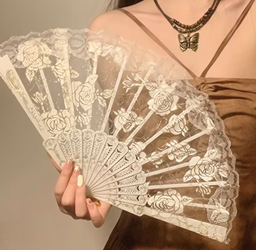 Bej renkli, çiçek desenli zarif dantel işlemeli katlanabilir yelpaze.
