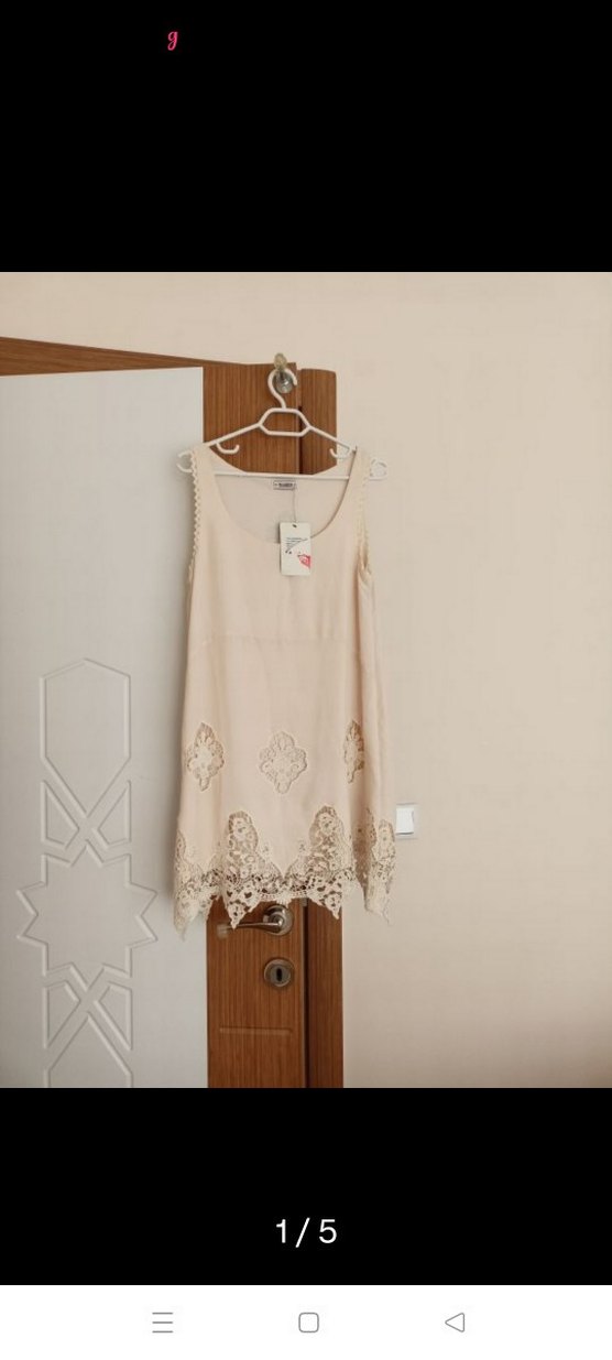 Bej renkte, dantel işlemeli, kolsuz, straplez yaka , astarlı,bol kesim mini elbise.