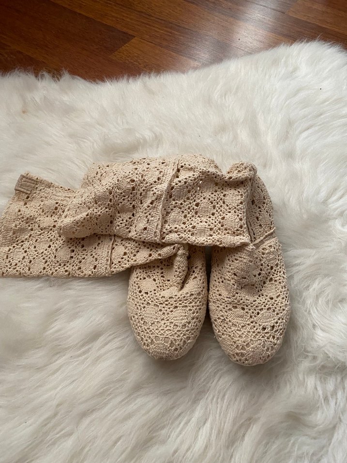 Bej renkli, işlemeli dantel detaylı örgü botları, bohem ve retro tarzda, pastel tonlarda.