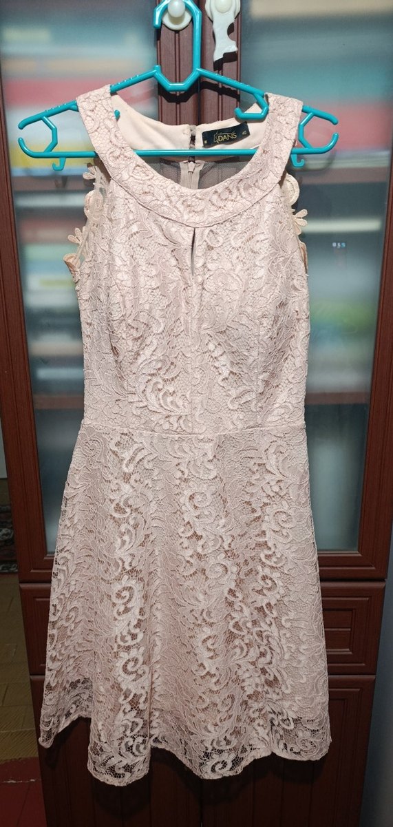 Pudra renk dantel işlemeli, kolsuz ve V yakalı abiye elbise, klasik ve vintage tarzıyla düğünler için uygun. 40 beden yazıyor ama 38 bedene de olur