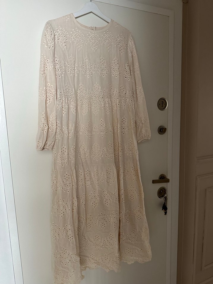 Bej renkte, işlemeli dantel detaylı uzun ve bol kesim elbise. Yumuşak keten kumaştan, uzun kollu ve yuvarlak yakalı, bohem tarzında.