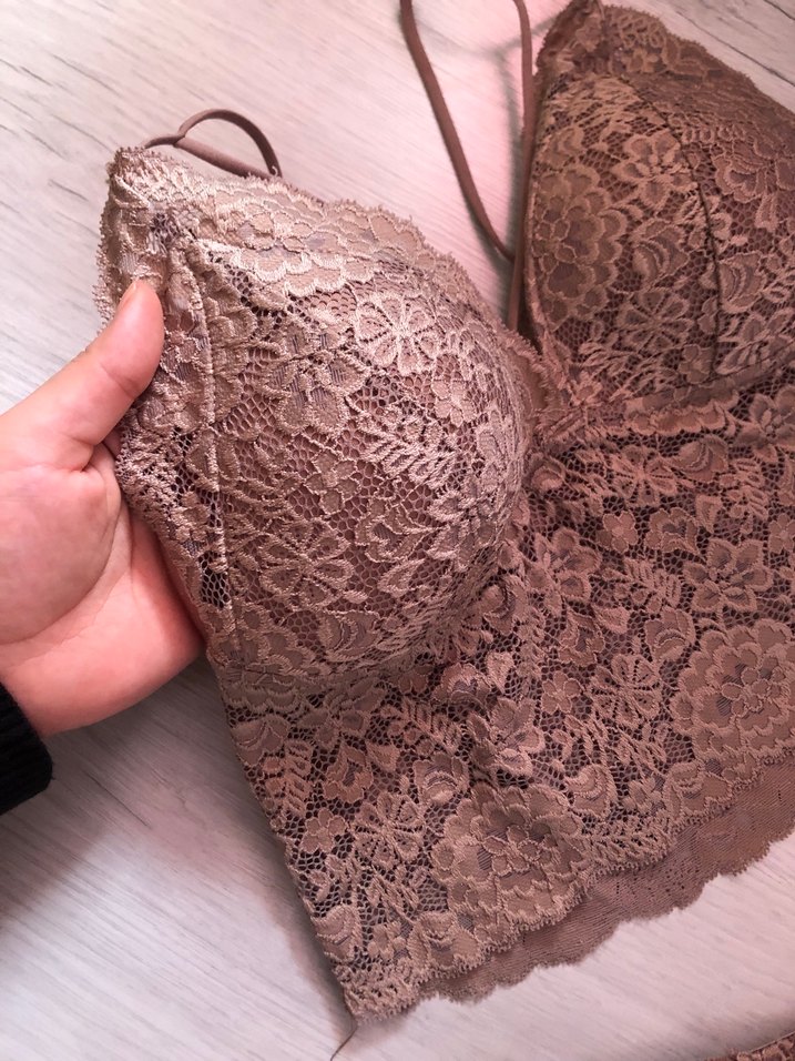 Yumuşak çiçek desenli dantel ve ayarlanabilir askılarla bej, rahat bohem tarzda kadın bralet.