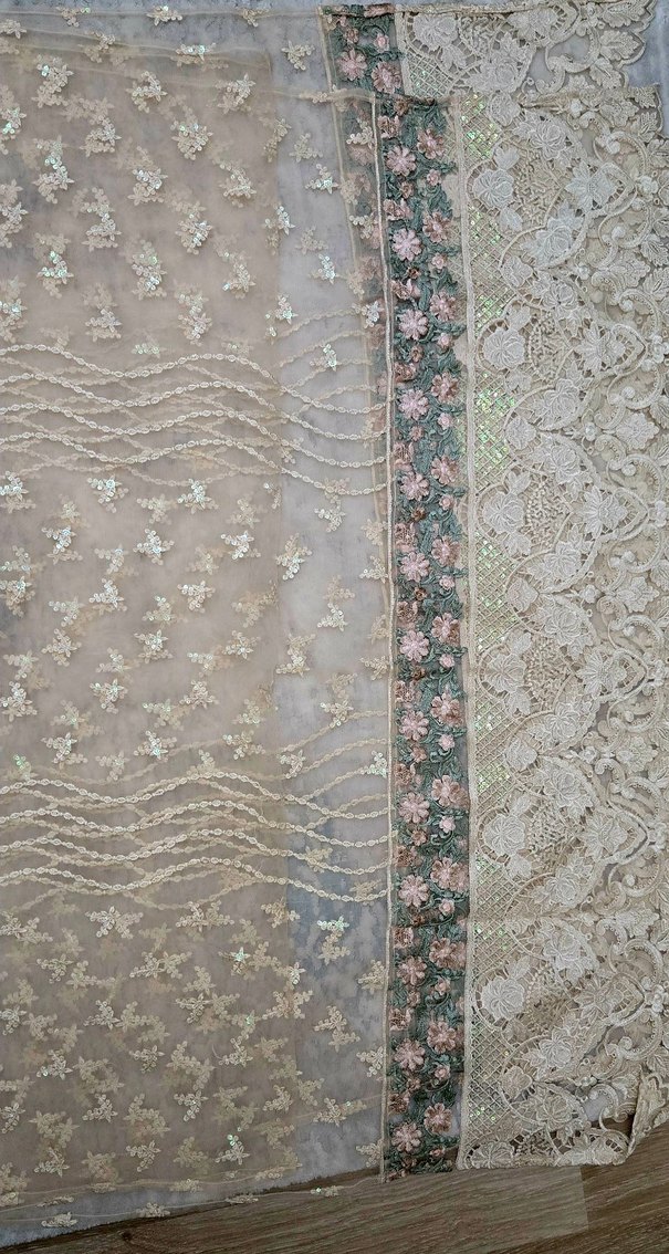 Bej renkli kumaş parça, dantel detayları ve çiçek işlemeli tekstil kenarı ile bohem tarzını yansıtır. şal olarak da kullanabilir oluyor hindistan'da ..2.5 metrelik bir parça birina olsa kiyafet yapmak için da kullanabilir. Yurt dişindan satin aldım güzel şık bir parça.