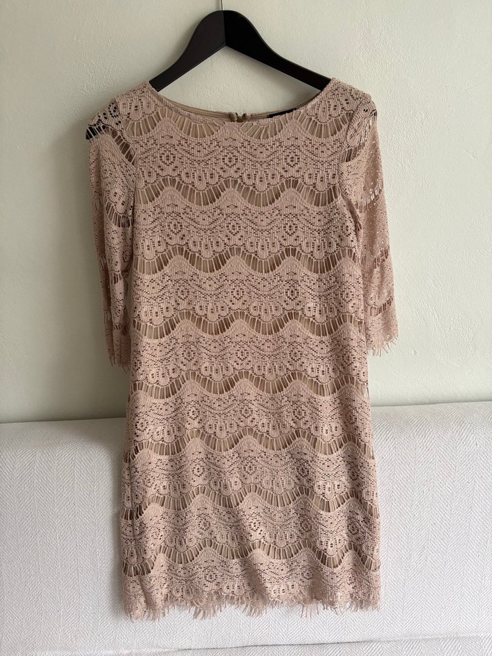 Fitted kesim, kısa kollu ve tekne yaka bej midi elbise, detaylı dantel nakışlıdır. Bohem tarzıyla romantik akşamlar için uygundur. La redoute marka, yurt disinda butikten alinmistir.