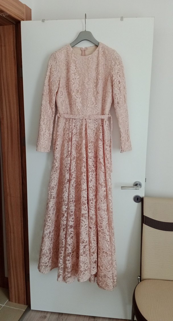 Bej renkte, uzun kollu ve tek parça dantel kumaştan yapılmış vintage tarzda uzun elbisedir. Tekne yaka ve normal kesimlidir, düğünler için uygundur.
