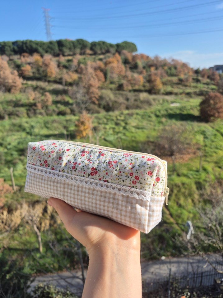 Bej renkli, çiçek desenli ve dantel detaylı kumaş makyaj çantası. Pastel tonları ve bohem tarzıyla vintage ve retro sevenlere uygun.