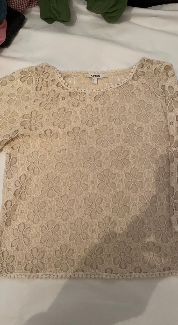 Bej renkte, dantelli ve yuvarlak yakalı bluz. Kısa kollu ve bol kesim, vintage bohem tarzını yansıtır. Günlük kullanıma uygundur.