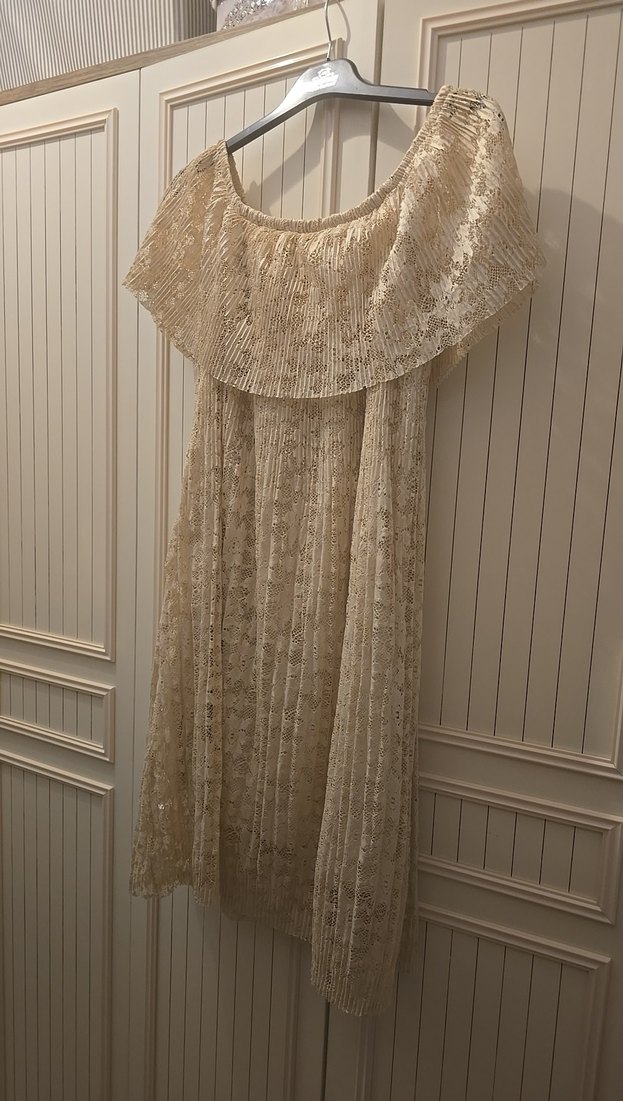Bej renkli, diz üstü boy, drapeli ve nakışlı desenli bohem tarzda kadın elbisesi. Askısız, salaş kesim ve kolsuz